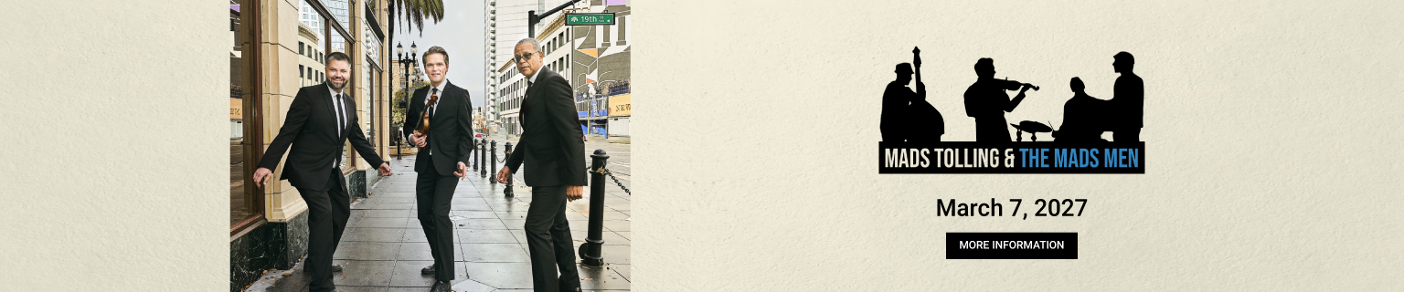 Two-time Grammy-winning violinist Mads Tolling and The Mads Men deliver a high-energy, world-class reimagining of 1960s soundtracks, blending sophisticated jazz arrangements with a nostalgic yet boundary-pushing flair that has captivated audiences from the Hollywood Bowl to Radio City Music Hall.